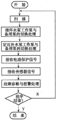 所有循環(huán)水泵的出水口都裝有水流傳感器,PLC檢測該水流傳感器的輸出信號,以判斷該水泵啟動后是否有水流輸出、并進(jìn)行工作正常指示或不正常報警指示。兩臺定壓補水泵公用一個水流傳感器,工作原理同上。